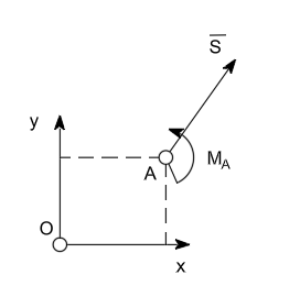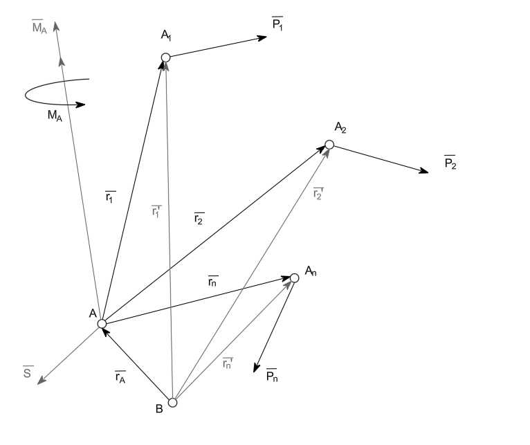 $$ \overline{M_{B}}=\overline{M_{A}}+\overline{r_{A}} \times \bar{S} $$Z tego równania wynika, że wektor momentu ogólnego układu sił, określony względem nowego bieguna B, jest równy sumie geometrycznej wektora momentu ogólnego określonego względem bieguna starego A oraz wektora momentu, jaki względem nowego bieguna daje wektor sumy zaczepiony w starym biegunie.