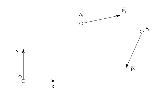 Rozważmy zbiór sił \(P_{1}, \ldots, P_{n}\) w płaszczyźnie xy zaczepionych w punktach \(A_{1}, \ldots, A_{n}\) (rys3). Na drodze tzw. redukcji układu sił można zastąpić działanie takiego układu układem prostszym